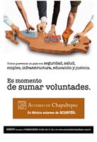 The Chapultepec Agreement, whose full name is the National Agreement for Unity, Rule of Law, Development, Investment and Employment, is a document signed by many segments of Mexican society, including politicians, athletes, academics, farmers, businessmen, students, intellectuals, media, professionals, artists and other members of civil society, all of whom have accepted joint responsibility for the growth of the country, respectful of the State’s constitutional role, to coordinate and lead the effort of all Mexicans in the growth and development of Mexico; more than 1,200,000 individuals interested in the welfare and development of the country have endorsed this agreement.