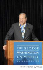 “Carlos Slim has matched his extraordinary success in business with a passionate commitment to improve the standard of living of future societies. In the past, GWU medal has been awarded to successful businessmen, renowned philanthropists and humanitarian leaders. Today, “the Medal is awarded to a man that fulfills all these virtues and more,” said GWU President Steven Knapp to a crowded ceremony that included the Mexican Ambassador, Arturo Sarukhan.