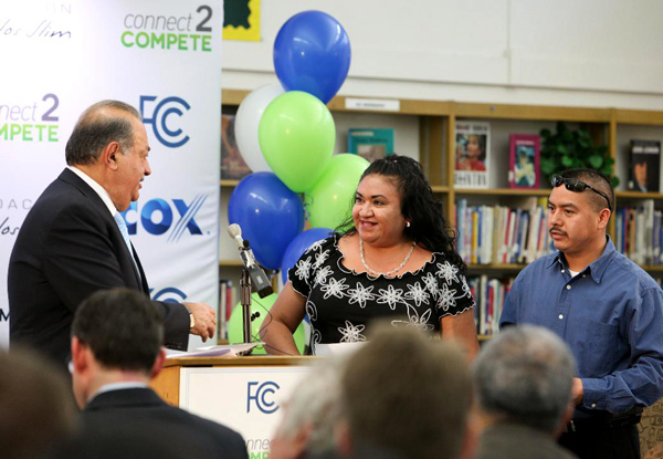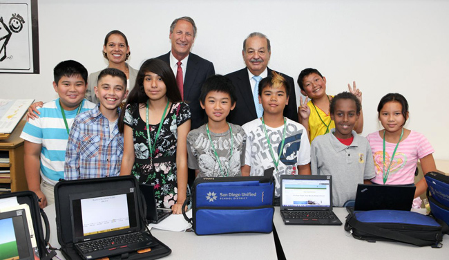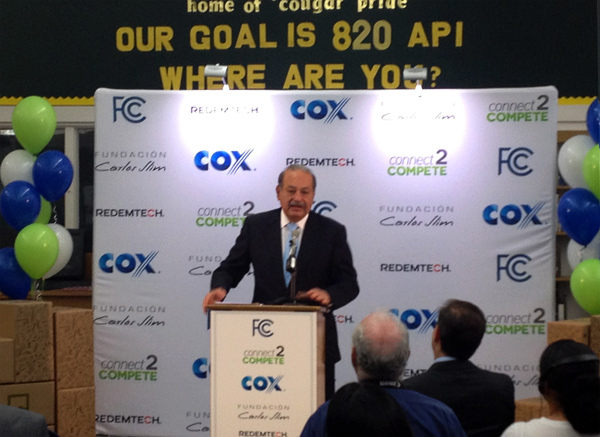 SAN DIEGO – The Carlos Slim Foundation announced a $3 million donation to Connect2Compete, a public-private partnership aimed at using innovative technology to provide the education content to ensure students can compete in the global economy by extending broadband technology to unconnected Latino households across the United States. Slim, who will also be a founding member of the Connect2Compete governing board, made the announcement today at the organization's pilot event at Horace Mann Middle School in San Diego, California.