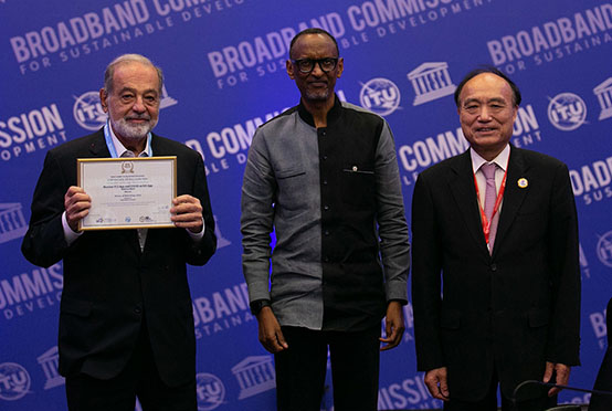 El Ing. Carlos Slim Helú recibió el premio por parte del Secretario General de la UIT, Houlin Zhao, durante su participación como Copresidente de la Comisión de Banda Ancha de la Unión, ante el pleno de los comisionados y el Presidente de Ruanda, Paul Kagame, quienes llevan a cabo en Kigali la reunión anual de primavera del organismo, bajo el título “Impulsar la transformación digital inclusiva”.